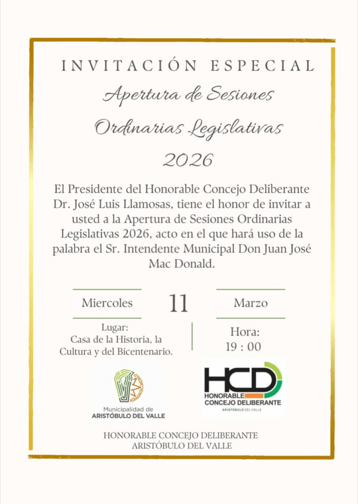 El Honorable Concejo Deliberante de Aristóbulo del Valle ha hecho oficial la convocatoria para el inicio del ciclo legislativo correspondiente al año 2026. El Dr. José Luis Llamosas, en su carácter de Presidente del cuerpo deliberativo, extendió la invitación formal a toda la comunidad para participar de la Apertura de Sesiones Ordinarias Legislativas.